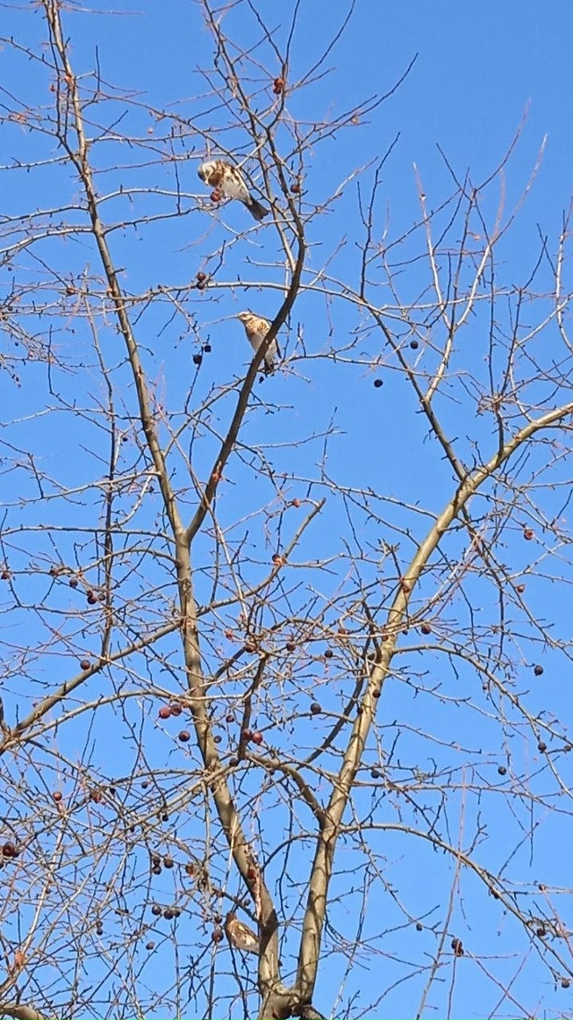Доброе утро, похоже это рябинники, которые известны своим шумным характером и характерным «трещащим» голосом, напоминающим «ра-ра-ра-ра» или «чак-чак». Если подойти к стае поближе, они обычно начинают громко перекликаться, прежде чем перелететь на соседнее дерево. Скворцы тоже уже прилетели в Лыткарино, пора делать для них домики.