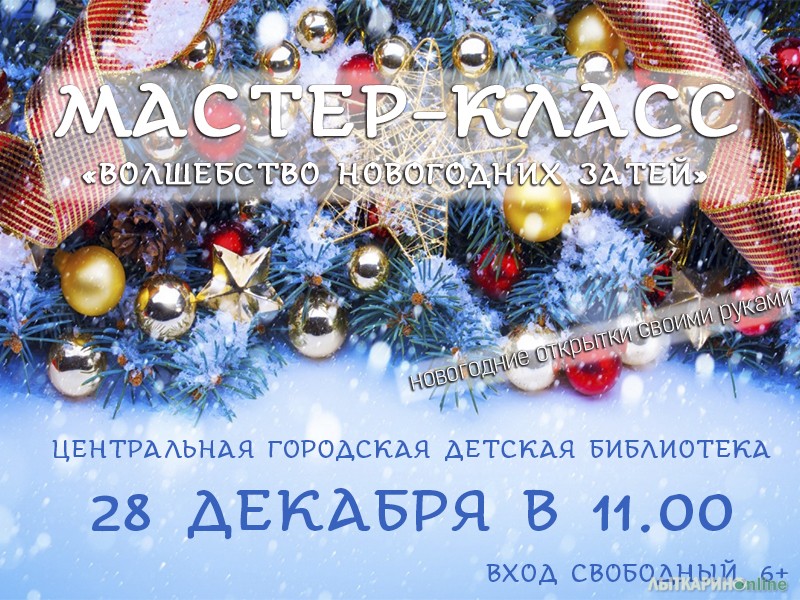 Центральная городская детская библиотека вход свободный Приглашаем детей, их родителей, бабушек и дедушек на мастер-класс по изготовлению новогодней открытки своими руками! Центральная городская детская библиотека, 28 декабря в 11.00 Вход свободный, 6+