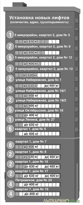 В Лыткарино до конца 2016 года будет произведена замена 12 лифтов в 8 домах, в 2017 году планируется заменить 47 лифтов в 16 домах. Во многих из этих домов также планируется произвести ремонт лифтовых шахт общей площадью более 150 кв. метров.