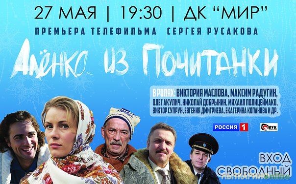 27 мая (среда) в 19:30 в ДК "Мир" состоится премьера художественного телефильма "Аленка из Почитанки" (производство телеканала "Россия-1", кинокомпания "АВК").