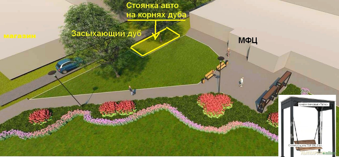 "Благоустройство" на въезде в Лыткарино - столетний дуб на зеленой поляне у МФЦ. Три года назад руководство МФЦ устроило автостоянку на корнях дуба, и он начал медленно сохнуть - листва стала жухлая и редкая - там за углом к Пятерочке еще один такой же 100-летний дуб - тот благоухает. http://lytkarino.com/wp-content/uploads/%D..._compressed.pdf