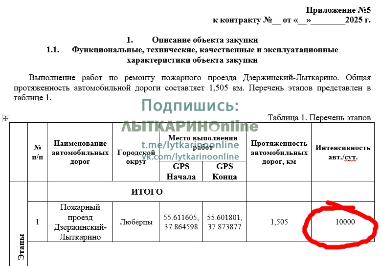 10000 автомобилей в сутки - такая интенсивность движения предполагается через пожарный проезд (пьяную дорогу) между Лыткарино и Дзержинским. Скриншот из приложения к контракту.