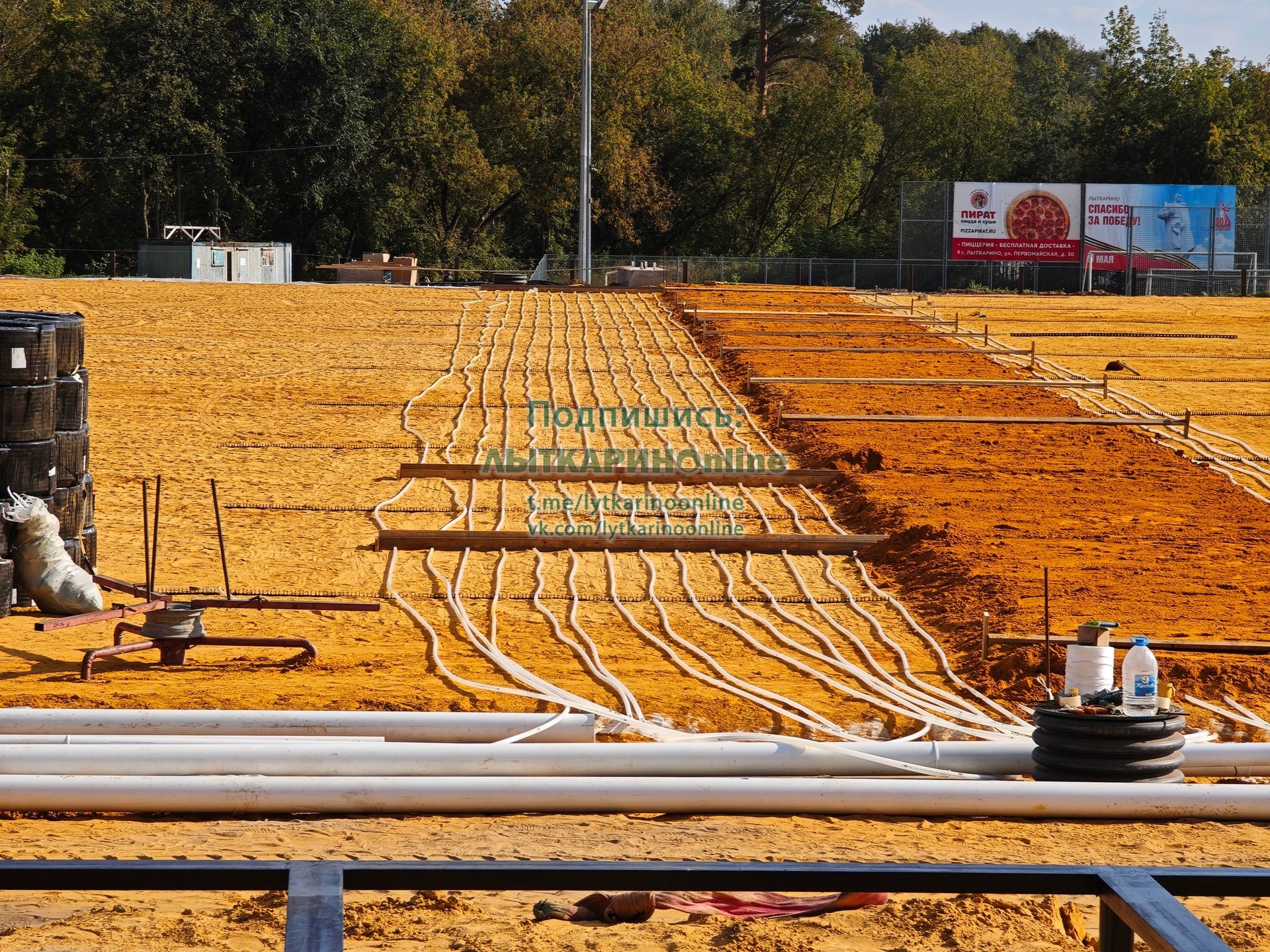 На Полёте наконец-то начали укладывать трубы подогрева футбольного поля. Вот как это выглядит.
