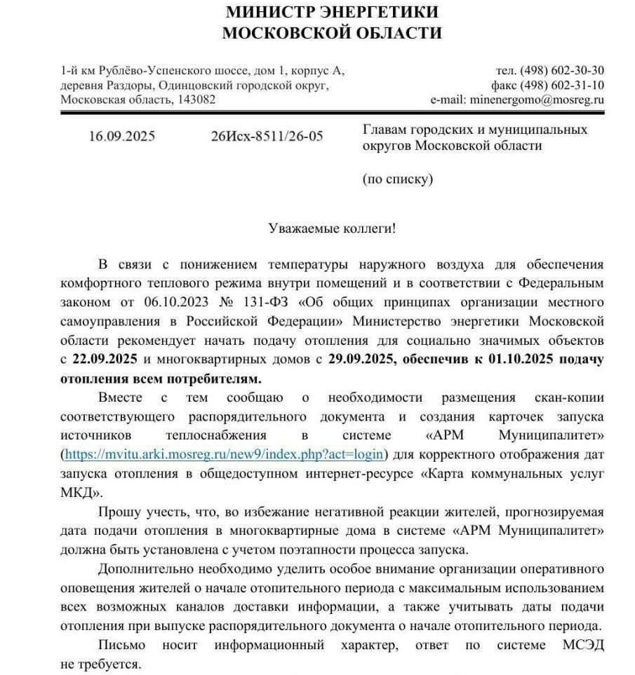 Министерство энергетики Московской области рекомендует начать подачу отопления в социально значимые объекты с 22 сентября, а в многоквартирные дома — с 29 сентября. Обеспечить теплом всех потребителей министр поручил уже к 1 октября.