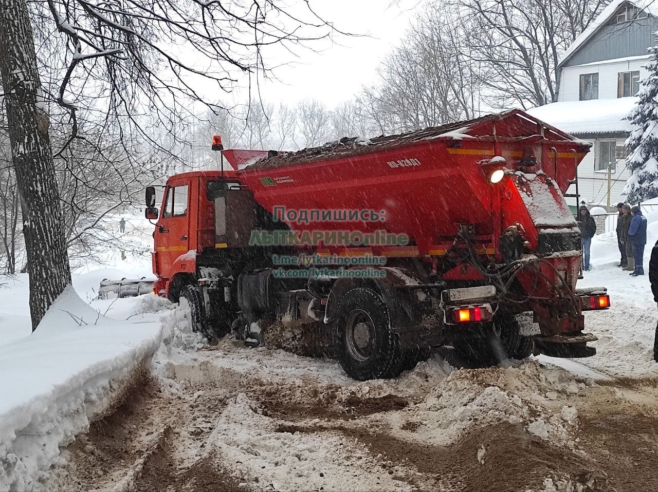 На спуске к пьяной дороге встала поперëк очистительная машина. Заодно и газель не может подняться. Движение перекрыто.