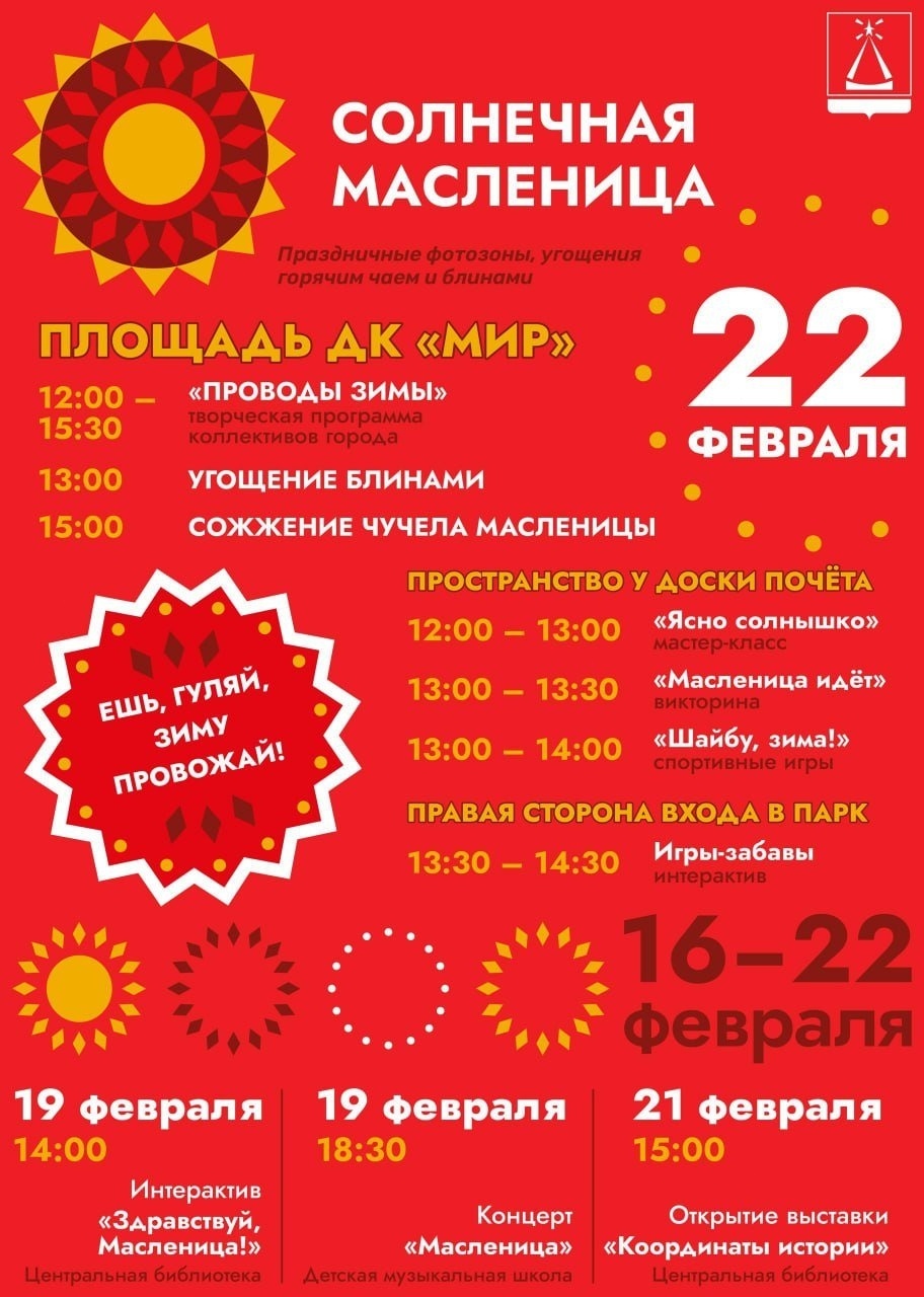 Масленица в городе Лыткарино состоится 22 февраля в 12:00 на центральной площади нашего города.