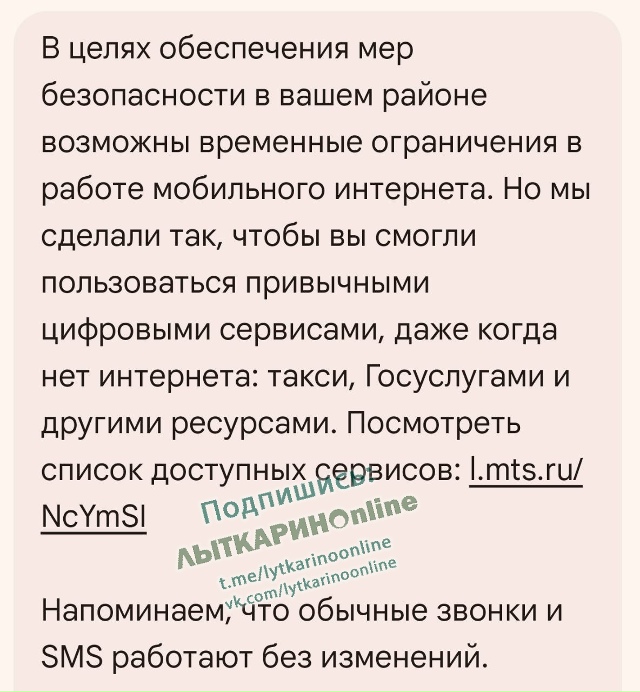В Лыткарино начинается работа в интернете по белым спискам 🤔 Сегодня пришло вот такое сообщение. В некоторых других городах такая практика уже используется.