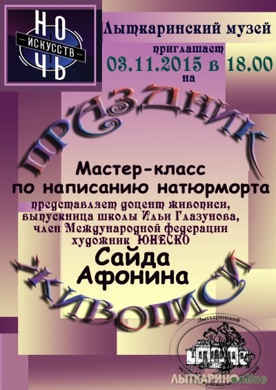 Лыткаринский музей ПРИГЛАШАЕМ НА АКЦИЮ "НОЧЬ ИСКУССТВ"! 3 ноября в 18:00 в Лыткаринском историко-краеведческом музее пройдет мероприятие «Праздник живописи» в рамках III ежегодной всероссийской культурно-образовательной акции «Ночь искусств», организованной Министерством культуры Московской области. В программу входит: - музыкально-обзорная презентация выставки работ московских художников «Дома с историями»; - мастер-класс по написанию натюрморта от известной художницы Сайды Афониной, доцента живописи, выпускницы школы Ильи Глазунова, Члена Международной федерации художников ЮНЕСКО; - уникальный опыт общения с выдающимися художниками об их работах, творчестве и мастерстве. Приходите, станьте участником удивительных таинств мастеров живописи!