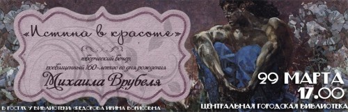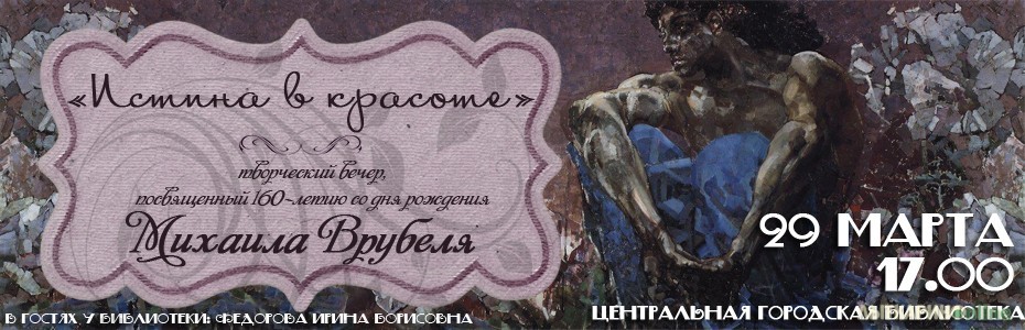 Центральная городская библиотека вход свободный 29 марта в Центральной городской библиотеке состоится творческий вечер "Истина в красоте", посвященный 160-летию со дня рождения Михаила Врубеля.