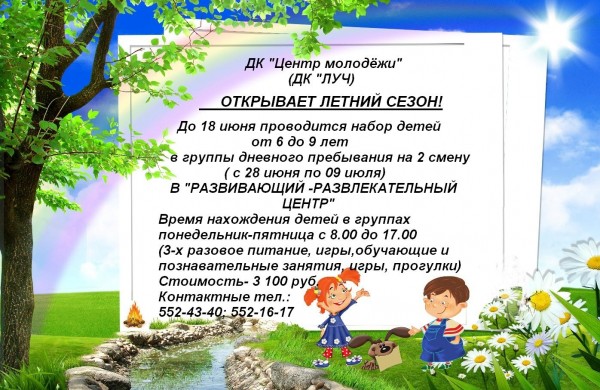 Афиша> Открытие летнего сезона! объявляется набор детей от 6 до 9 лет в группы дневного пребывания детей в развивающий-развлекательный центр на 2 смену