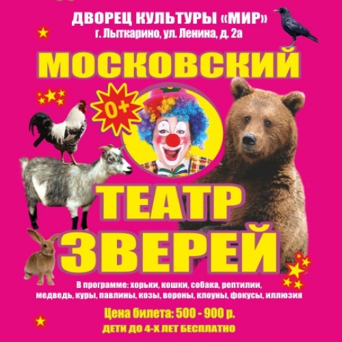 ДК "МИР" 500-900 р. 04 декабря в 12.00 в ДК "МИР" состоится представление МОСКОВСКОГО ТЕАТРА ЗВЕРЕЙ: большая группа дрессированных животных - МЕДВЕДЬ, ХОРЬКИ, СОБАКИ, КОШКИ, КОЗЫ, РЕПТИЛИИ, ПАВЛИНЫ, ВОРОНЫ, КУРЫ, артистов оригинального жанра - жонглеров, магов, иллюзионистов, фокусников, а также знаменитого клоуна Николаши.