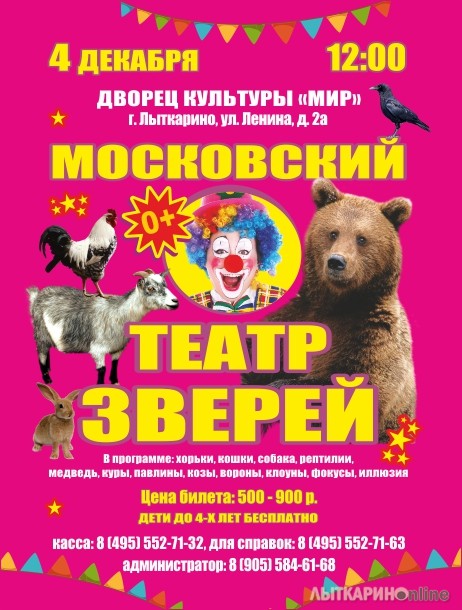 ДК "МИР" 500-900 р. 04 декабря в 12.00 в ДК "МИР" состоится представление МОСКОВСКОГО ТЕАТРА ЗВЕРЕЙ: большая группа дрессированных животных - МЕДВЕДЬ, ХОРЬКИ, СОБАКИ, КОШКИ, КОЗЫ, РЕПТИЛИИ, ПАВЛИНЫ, ВОРОНЫ, КУРЫ, артистов оригинального жанра - жонглеров, магов, иллюзионистов, фокусников, а также знаменитого клоуна Николаши.