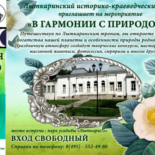 20 мая в 18:00 в парке усадьбы «Лыткарино» состоится экологический марафон «В гармонии с природой». Путешествие по Лыткаринским тропам откроет тайну богатства нашей планеты и особенности природы родного края. Праздничную атмосферу создадут творческие конкурсы, игры, сюрпризы и многое другое.