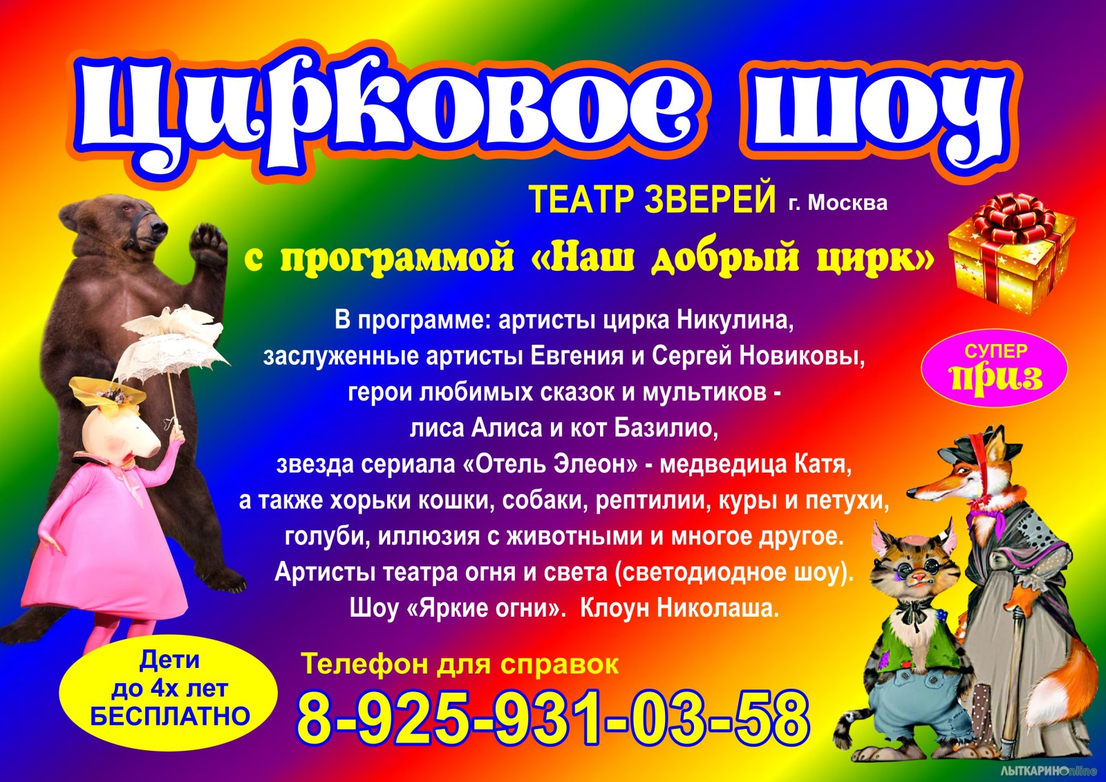 Друзья, Театр зверей снова дает представление в г. Лыткарино! В программе "Наш добрый цирк" выступят наши дрессированные животные - собачки, голуби, хорьки, поросенок, питон и мн. др. во главе с нашей звездочкой - талантливой медведицей Катей - и артистами оригинального жанра. Не пропустите это потрясающее шоу!