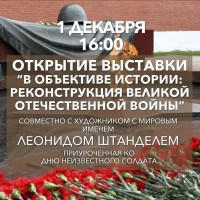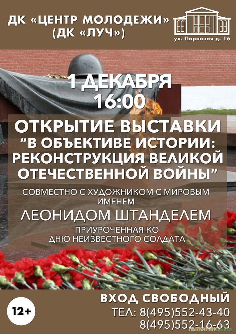 1 декабря в 16-00 в фойе ДК «Центр Молодежи» состоится открытие оригинальной фотовыставки «В объективе истории: реконструкция Великой Отечественной войны», приуроченной ко Дню неизвестного солдата. Автор выставки – фотограф с мировым именем, житель Лыткарина – Леонид Штандель.