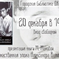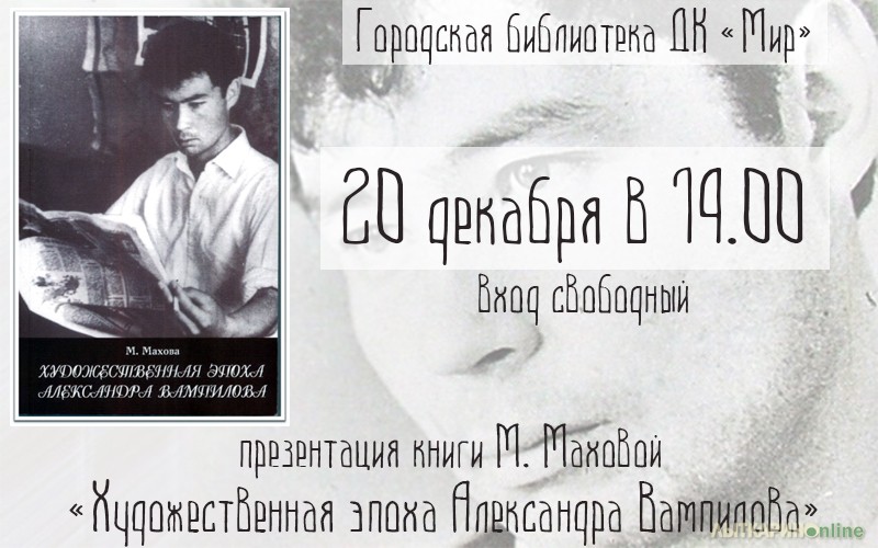 Городская библиотека ДК "Мир" вход свободный 20 декабря в 14.00 в Городской библиотеке ДК «Мир» пройдет презентация книги Музы Сергеевны Маховой «Художественная эпоха Александра Вампилова».