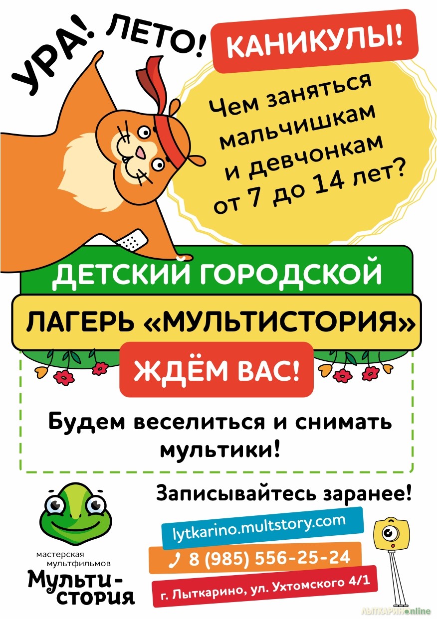 ул. Ухотомского, 4/1 Мультистория приглашает ребят от 7 до 14 лет провести самые незабываемые каникулы в городском лагере! Всё лето наши двери открыты! В нашем лагере каждую неделю - новый творческий сезон, каждый день - незабываемые квесты/игры/творческие мастер-классы, а главное - создание мультфильмов и анимационных проектов своими руками! А еще у нас: - Индивидуальный подход к каждому ребенку - Проектные работы и командные игры - Различные сказочные задания и фокусы - Рисование в самых разных техниках - Лепка из пластилина - Перевоплощение в героев мультфильмов - Актерское мастерство - Развитие мелкой моторики, видения цвета - И многое другое! А главное - у нас в лагере ну оочень весело!