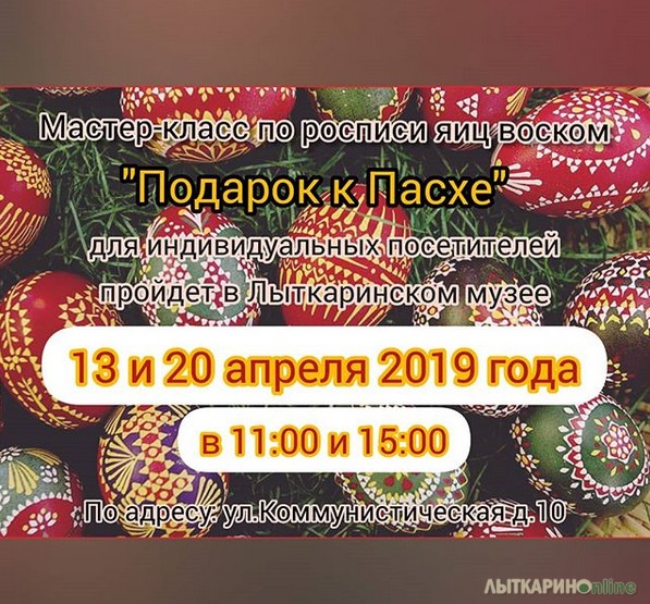 Лыткаринский историко-краеведческий музей 230/250 руб. (детский/взрослый) Лыткаринский историко-краеведческий музей приглашает всех желающих на познавательную программу с мастер-классом «Подарок к Пасхе». На ней Вы познакомитесь с историей и традициями празднования Светлой Пасхи, разными способами украшения пасхального сувенира, а также изготовите подарок своими руками - яйцо писанку. Ждем Вас 20 апреля в 11:00 и 15:00.