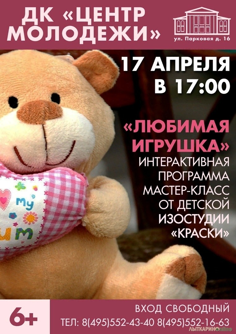 17 апреля, в 17.00, в ДК "Центр Молодежи" пройдет интерактивная программа мастер-класс "ЛЮБИМАЯ ИГРУШКА" от детской изостудии "Краски".