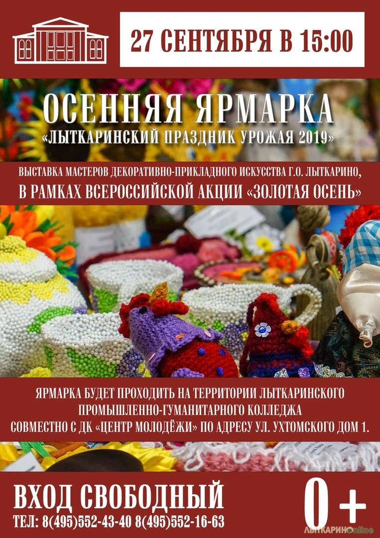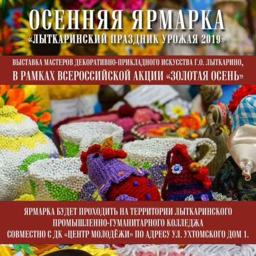Дорогие жители и гости города Лыткарино! Филиал "Лыткарино" университета "Дубна" и Дом культуры "Центр молодёжи" 27 сентября с 15.00 собирает вас на осеннюю ярмарку "Праздник урожая - 2019". Вас приятно удивят атмосферные игры, народные песни и пляски, аутентичные кушанья, предметы быта и интерьера в народном стиле. Всё создано силами и руками воспитанников ДК ЦМ и студентами ЛПГК. Этот проект открыт с целью поддержать молодые таланты, которые оттачивают своё мастерство в области традиционных промыслов славян. ПРИХОДИТЕ! БУДЕТ ВКУСНО И ВЕСЕЛО!