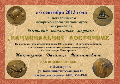 Лыткаринский историко-краеведческий музей 6 сентября в 14 часов в Лыткаринском историко-краеведческом музее открывается персональная выставка известного художника-медальера Василия Максимовича Никищенко «Национальное достояние». Он является жителем города Лыткарино более двадцати лет. С 1965 по 2008 год работал одним из ведущих граверов-художников на «Московском монетном дворе Гознака». На выставке представлены медали, гипсовые слепки, монеты из личной коллекции, в разработке и изготовлении которых В.М. Никищенко принимал непосредственное участие. Выставка продлится до конца октября, спешите увидеть «Национальное достояние»!