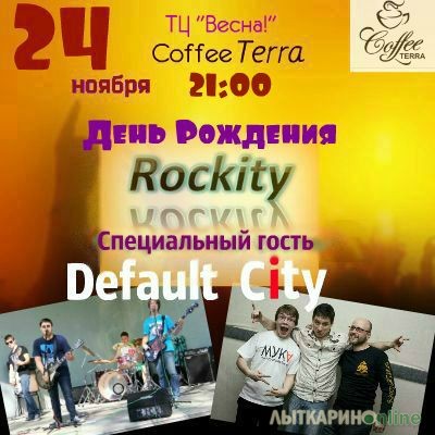 ТЦ Весна. Coffee Terra вход свободный группе Rockity ровно 1 год! Поздравить группу и порадовать поклонников приезжает группа Default City! Специальные именные коктейли, отличная музыка и песни ждут любого, кто заглянет в этот день на концерт-праздник.