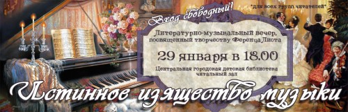 Центральная городская детская библиотека В читальном зале Центральной городской детской библиотеки 29 января в 18.00 состоится литературно-музыкальный вечер, посвященный жизни и творчеству венгерского композитора Ференца Листа.