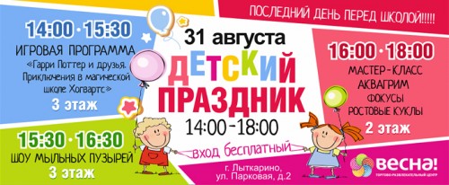ТРЦ "Весна" вход свободный ДЕТСКИЙ ПРАЗДНИК в ТРЦ "Весна" г. Лыткарино 31 августа с 14:00 до 18:00!