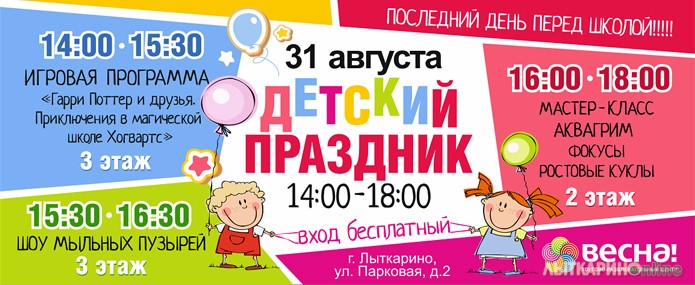 ТРЦ "Весна" вход свободный ДЕТСКИЙ ПРАЗДНИК в ТРЦ "Весна" г. Лыткарино 31 августа с 14:00 до 18:00!