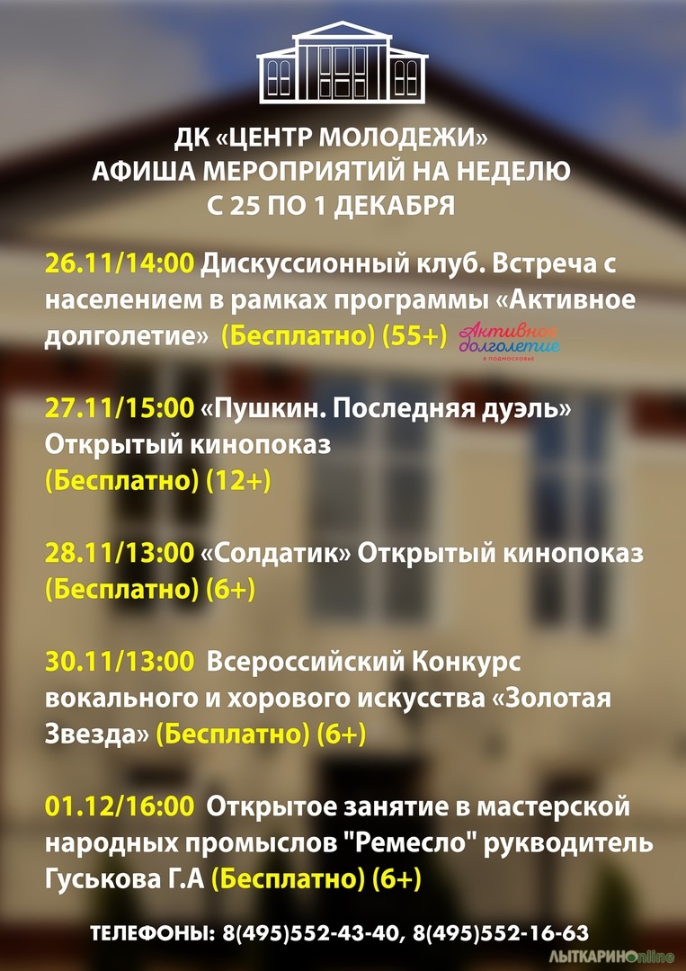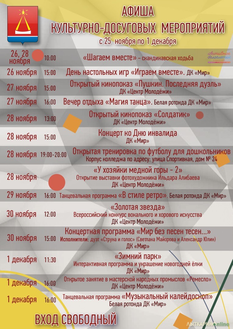 30 ноября 2019 в 15:30   190  0 Ледовый комплекс  вход свободный 30 ноября 2019 в 12:00   655  0 ДК "Центр молодежи"  вход свободный