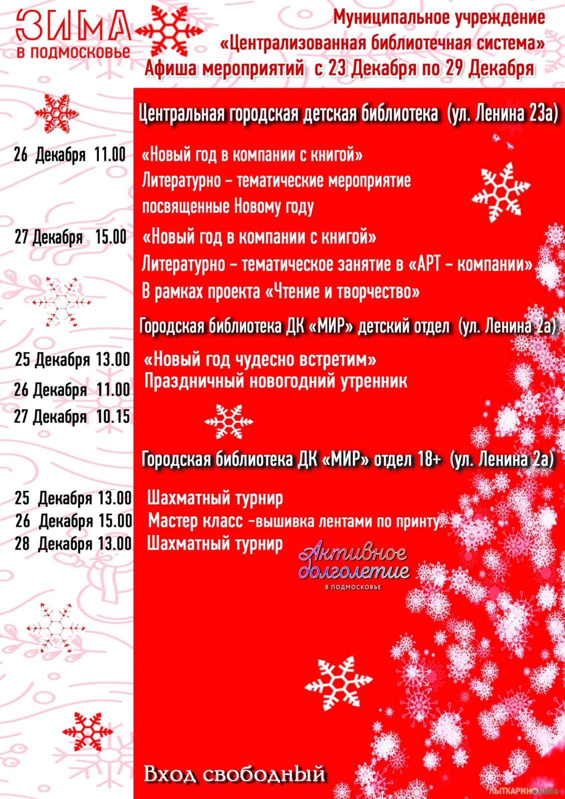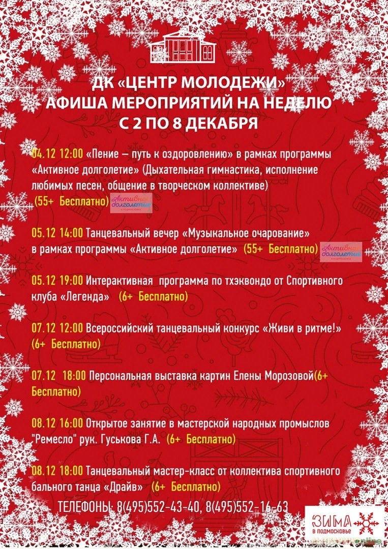 27 декабря 2019 в 18:00   544  0 ДК "Центр молодежи"  вход свободный 27 декабря 2019 в 17:00   728  0 адреса в афише  вход свободный