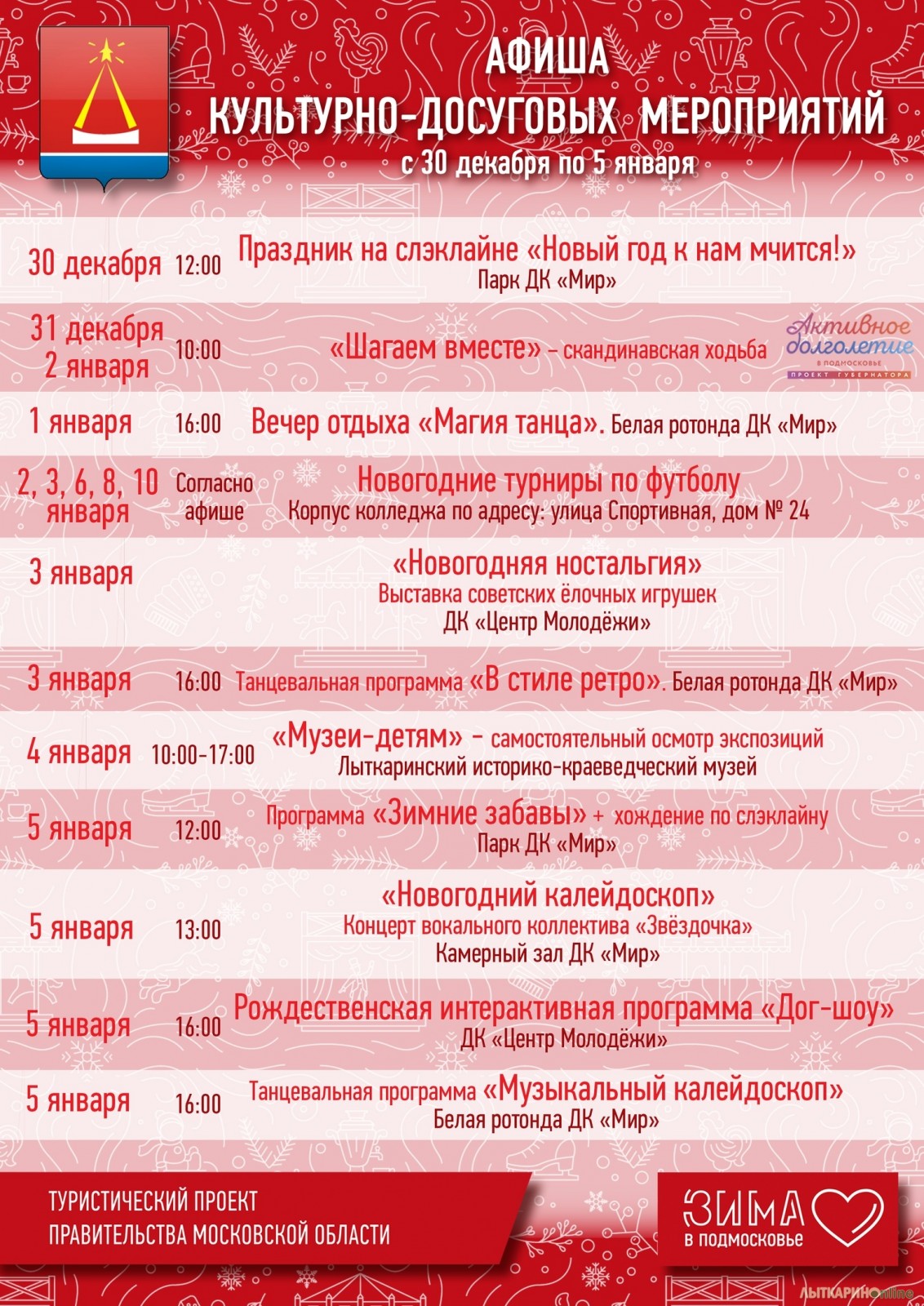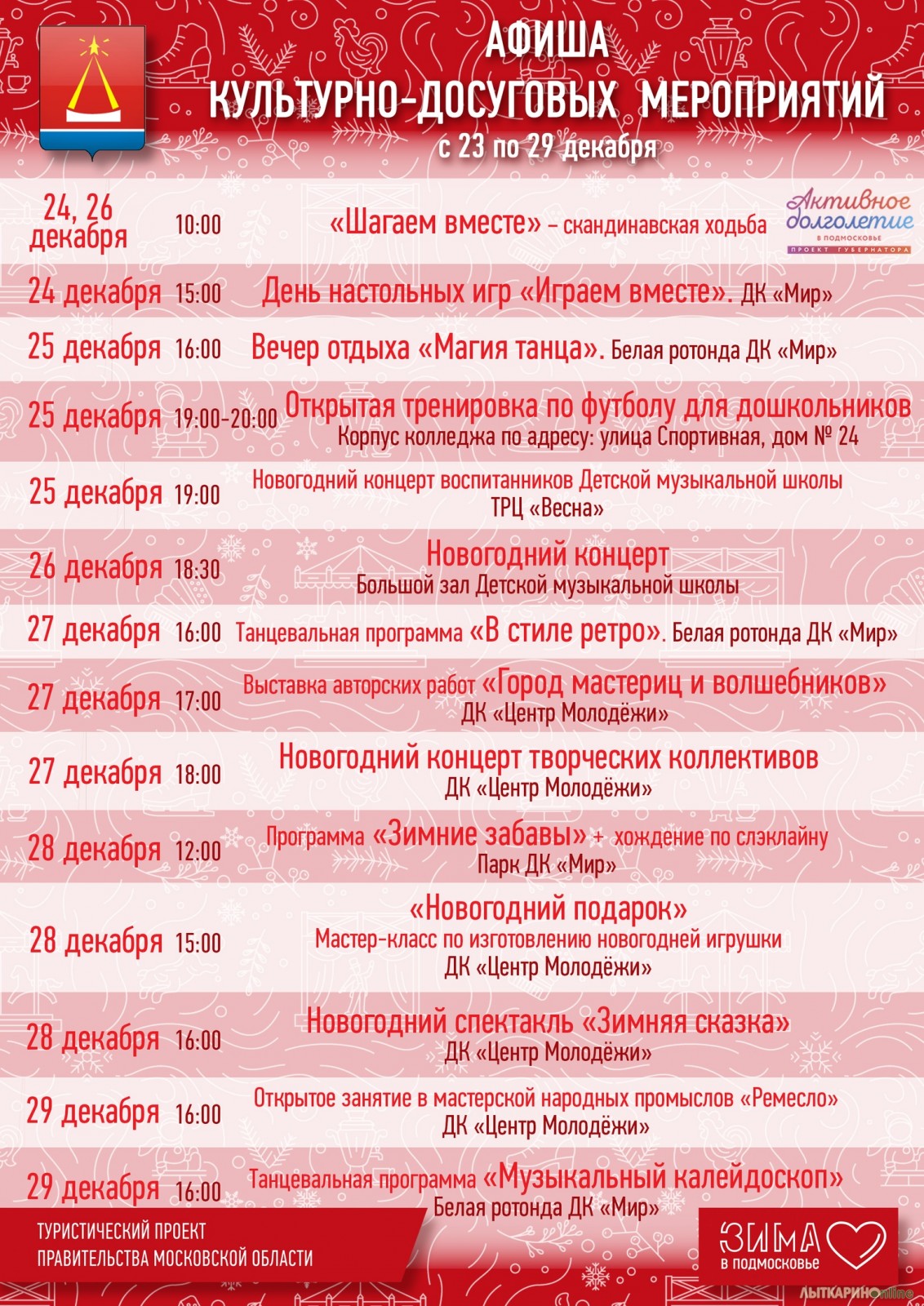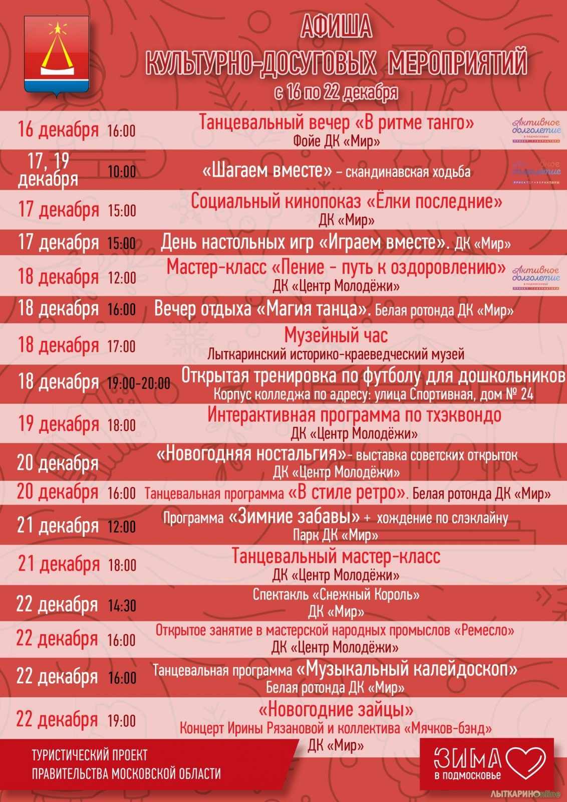 29 декабря 2019 в 19:00   355  0 Лыткарино  вход свободный 29 декабря 2019 в 17:00   452  0 ДК "МИР"  платно