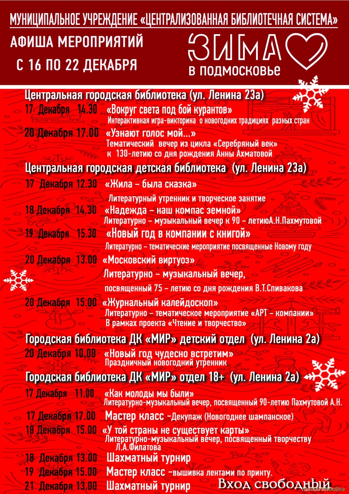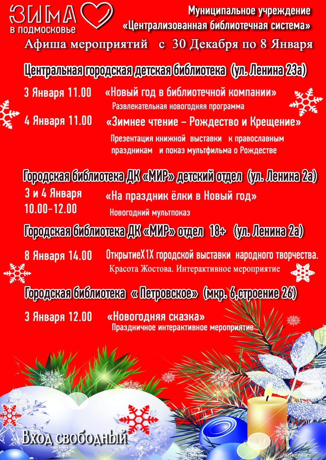 8 января 2020 в 19:00   930  0 Библиотеки  вход свободный 8 января 2020 в 12:00   888  0 ДК "Центр молодежи"  вход свободный