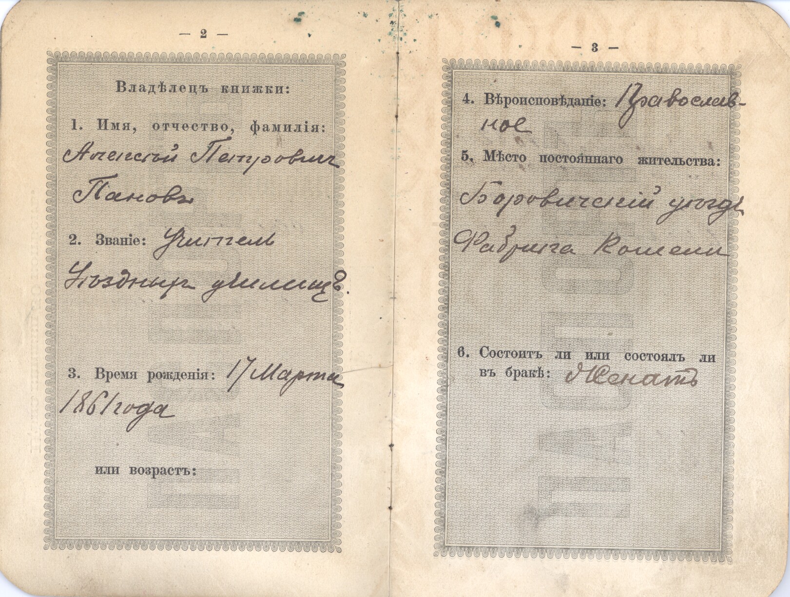 Южный Ветер Жалоба Опубликовано 4 января, 2007 с ума сойти... звание писали "учитель уездных училищъ".. а захотел стать клерком или сантехником - вперед, в мусарню, паспорт менять я вот тоже подумал: звание идёт вторым пунктом, а дата рождения третьим, вроде как до рождения уже всё было ясно. любопытно, а во сколько тогда пачпорт выдавали? Вставить Ник Поделиться сообщением Ссылка на сообщение