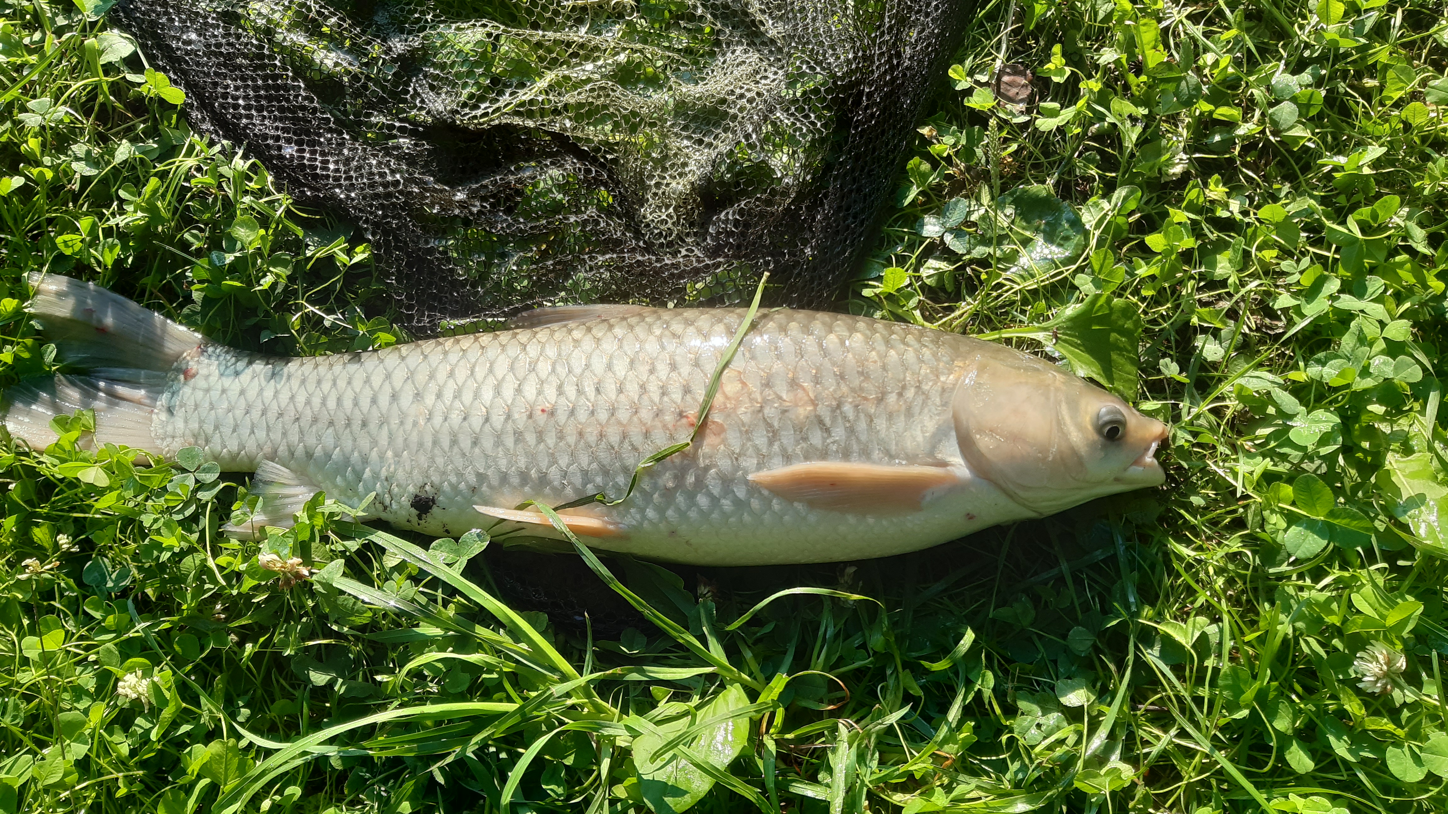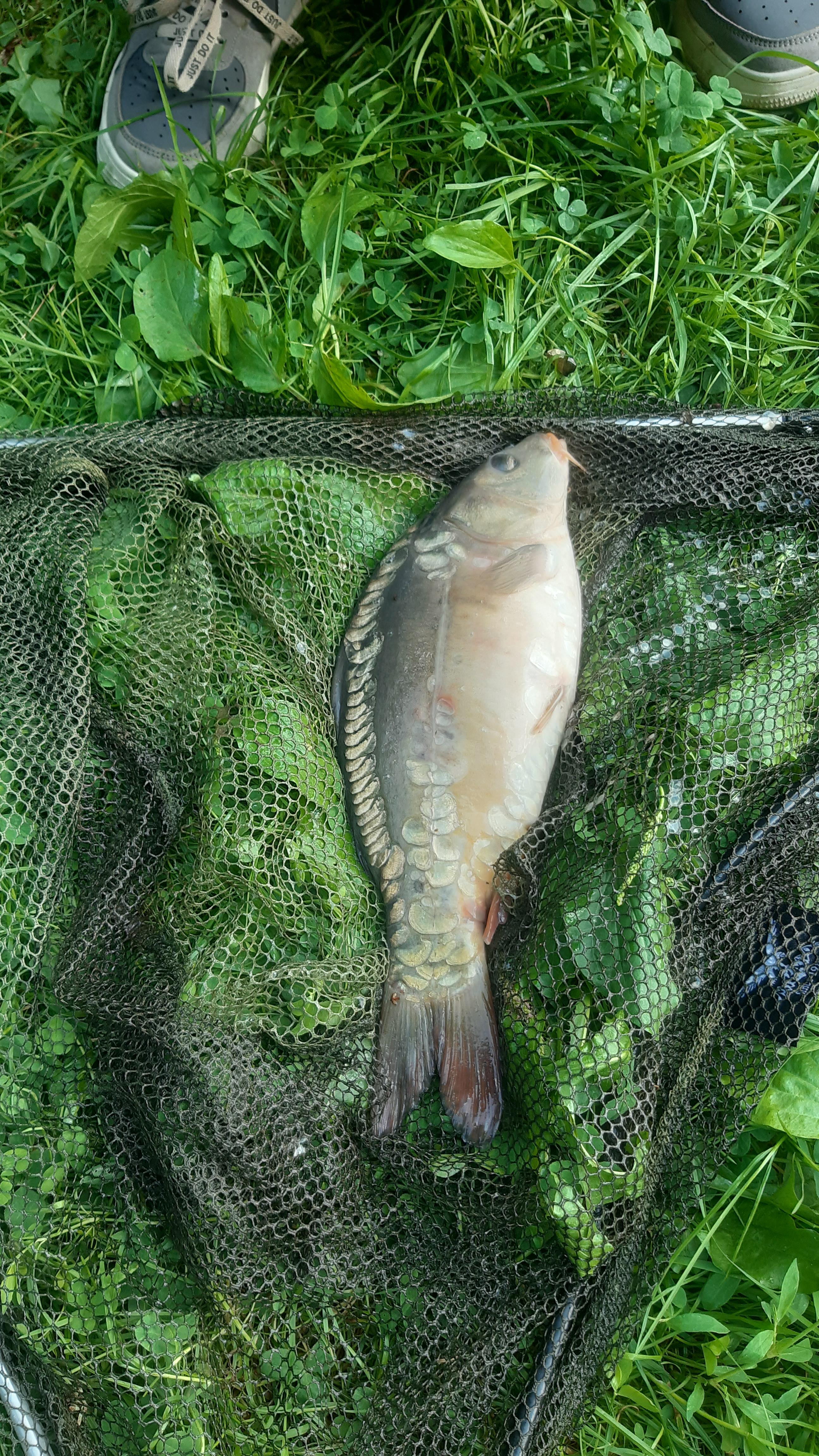 Первая поклёвка около 7, подсек, вывываживал минуты две и у берега что-то крупное сошло. Через полчаса еще поклевка, упорная борьба, белый амур, примерно 1.5 кг. Потом в девятом часу карась грамм 300. И часа через два карп зеркальный небольшой. Грамм 700.