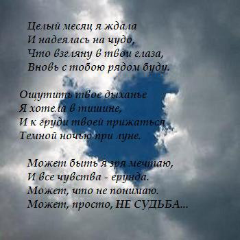Lelik.a Жалоба Опубликовано 4 сентября, 2006 Что на улице, снег или дождь, Или может быть солнце сверкает, Неужель никогда не поймешь, Что снежок обязательно таит. Распускают деревья листочки И трава зеленеет вокруг, А ты будешь плакать все время Потому что твой друг - не друг. Потому что не смог полюбить он Твое сердце, что больше морей, Потому что тебя променял он На подругу твоих же друзей.. Тебе кажется в пропасти ты И обратной не видишь дороги, И закрыты все жизни пути Для твоей наболевшей любви. Так зачем же ты плачешь и молишь, Чтоб вернуть события вспять, Неужели ему ты позволишь Свои чувства опять оскорблять. Ты подумай девчонка над этим, Ведь тебе ещё жить и жить.. И не раз ты ещё услышишь Я люблю тебя и буду любить... (посвещается моей знакомой...) Вставить Ник Поделиться сообщением Ссылка на сообщение