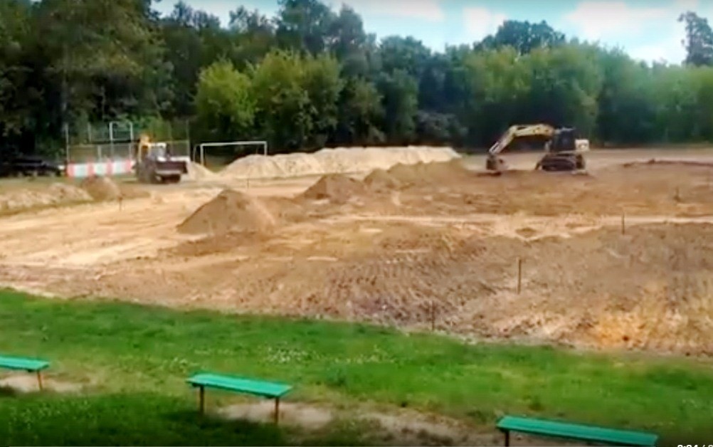 На объекте рабочие уже сняли верхний слой грунта и приступили к выравниванию поверхности поля, после чего пройдут работы по укладке искусственного газона.