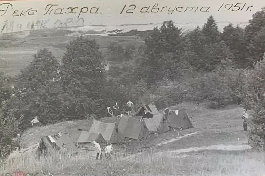 К сожалению, электронная версия фото не очень хорошего качества, и разобрать что-то на заднем плане практически не возможно, поэтому могу только предположить исходя из описания и того что фото сделано на возвышенности, что фото сделано на берегу Пахры (или может, не совсем у воды) недалеко от Зелёной слободы. Сейчас там полностью изменился рельеф из-за застройки и промышленной деятельности, но лет 20 назад там некоторых местах еще были сосны и ели (по размеру подходящие, чтоб 70 лет назад быть примерно как на фото) и холмы с которых видно Мячково (церковь в Зеленой слободе расположена также высоко по отношению к реке, как и в Мячково), и место, где сейчас располагаются СНТ Юбилейный, Каменный цветок и Вишенка (насколько я понимаю, раньше на их месте были карьеры и именно о них речь идет в описании).