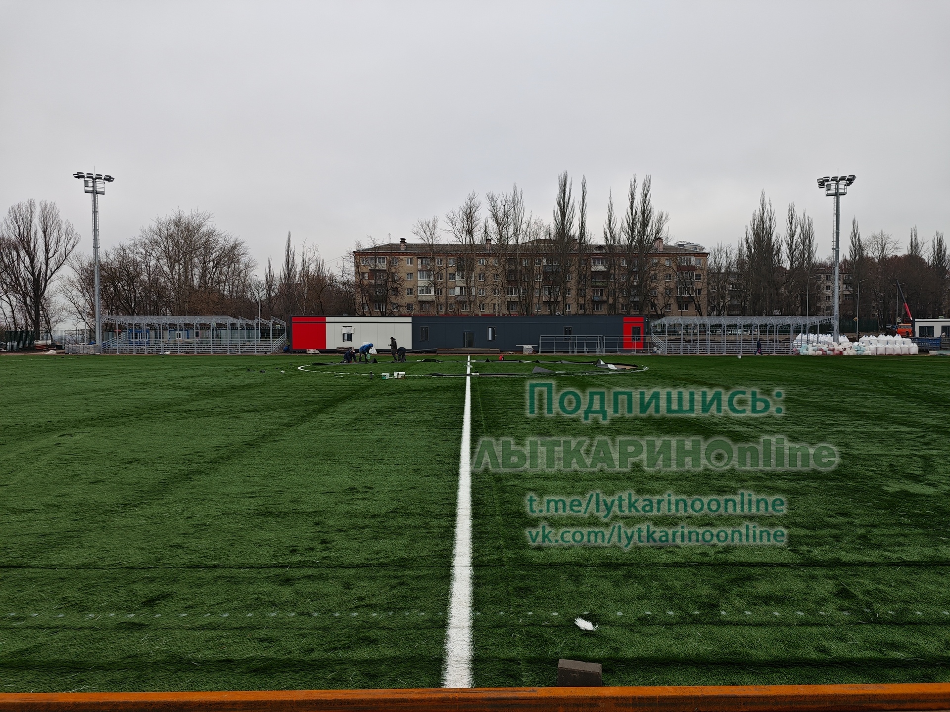На Полёте уже приклеивают разметку поля. Почти закончены трибуны для зрителей. Работа кипит, а погода явно даёт шанс уложиться в сроки. А ведь снег мог выпасть и месяц назад.