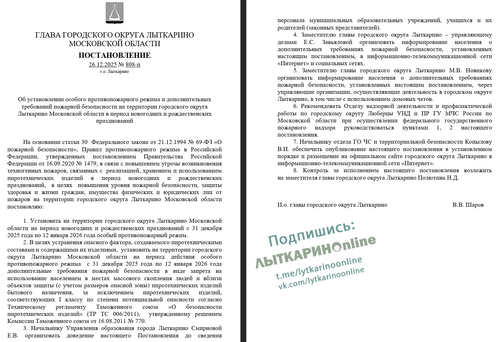 "В целях устранения опасного фактора, создаваемого пиротехническими составами и содержащими их изделиями, установить на территории городского округа Лыткарино Московской области на период действия особого противопожарного режима с 31 декабря 2025 года по 12 января 2026 года дополнительные требования пожарной безопасности в виде запрета на использование населением в местах массового скопления людей и вблизи объектов защиты (с учетом размеров опасной зоны) пиротехнических изделий бытового назначения, за исключением пиротехнических изделий, соответствующих I классу по степени потенциальной опасности...".