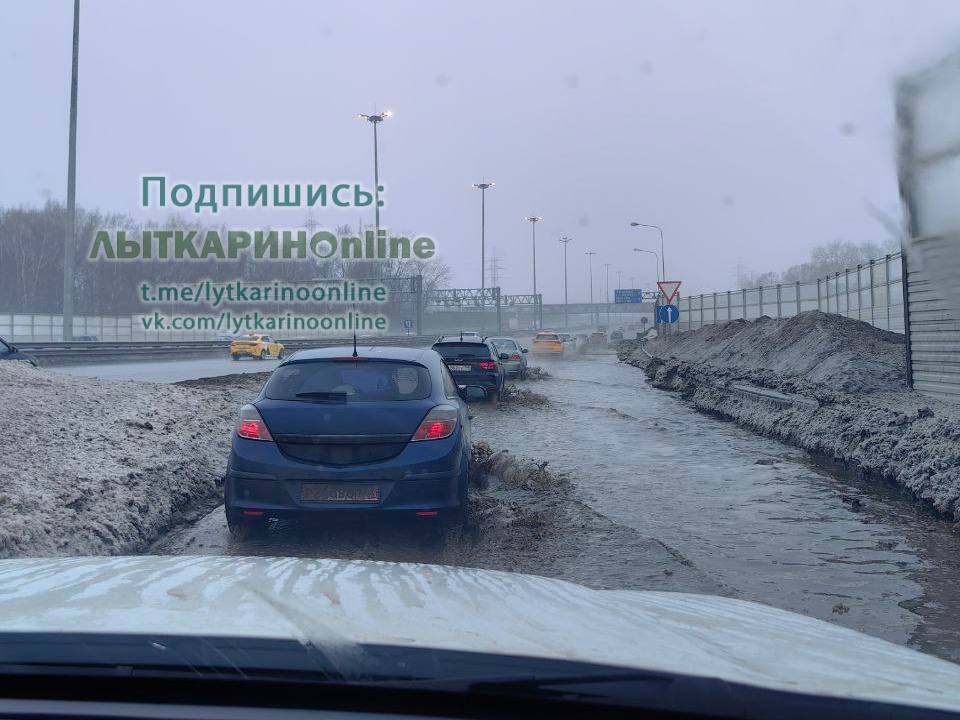 Мосавтодор, съезд с Лыткаринского шоссе - огромная лужа. Плюс стык на мосту - уже даже железка отвалилась. Почините: 55.630049, 37.943110
