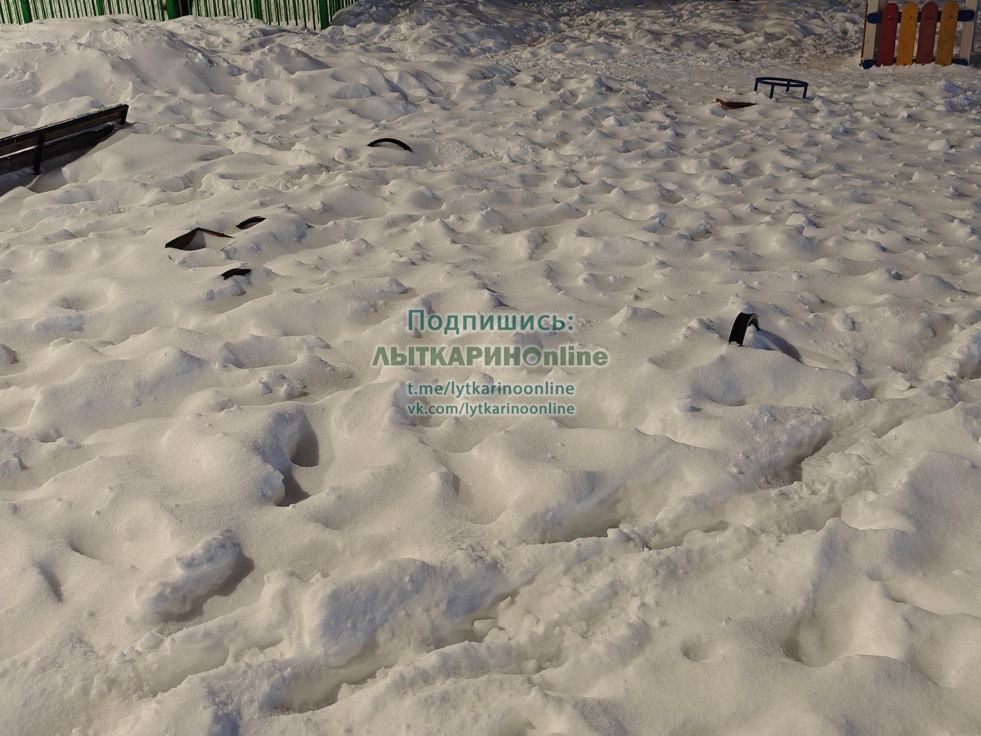 На первом фото лавочки и урна, на втором уровень снега выше сидушки качелей, качаются наверное стоя, на третьем грустит карусель.