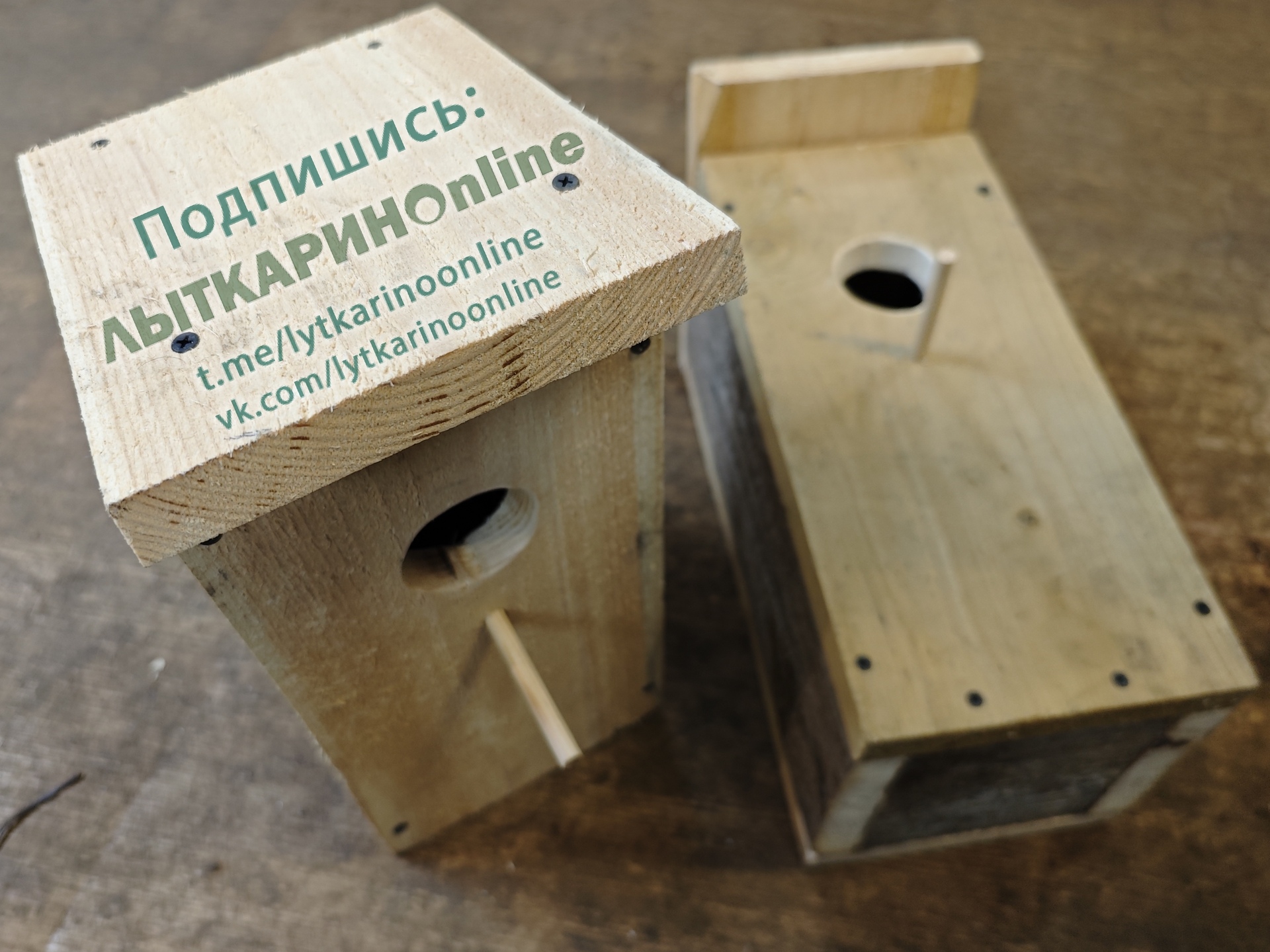 Кто дружит с руками и пилой: берём доски: дюймовку (не строганую) 20 см (на перед, зад и крышу), 15см (на боковушки и дно). Передняя стенка ~40см, задняя ~38. Отверстие ~5,5см выпиливаем лобзиком или коронкой. Вешаем на дерево отверстием на восток.