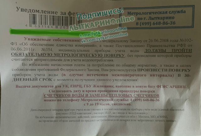 - Анонимность: в «шапке» указано общее название «Метрологическая служба по г. Лыткарино», а не конкретное название юридического лица с ИНН и т.п. Показать полностью… Настоящие сроки поверки ваших счетчиков можно узнать в квитанции ЖКХ (ЕПД): Обычно там указаны даты следующей поверки для каждого счетчика.